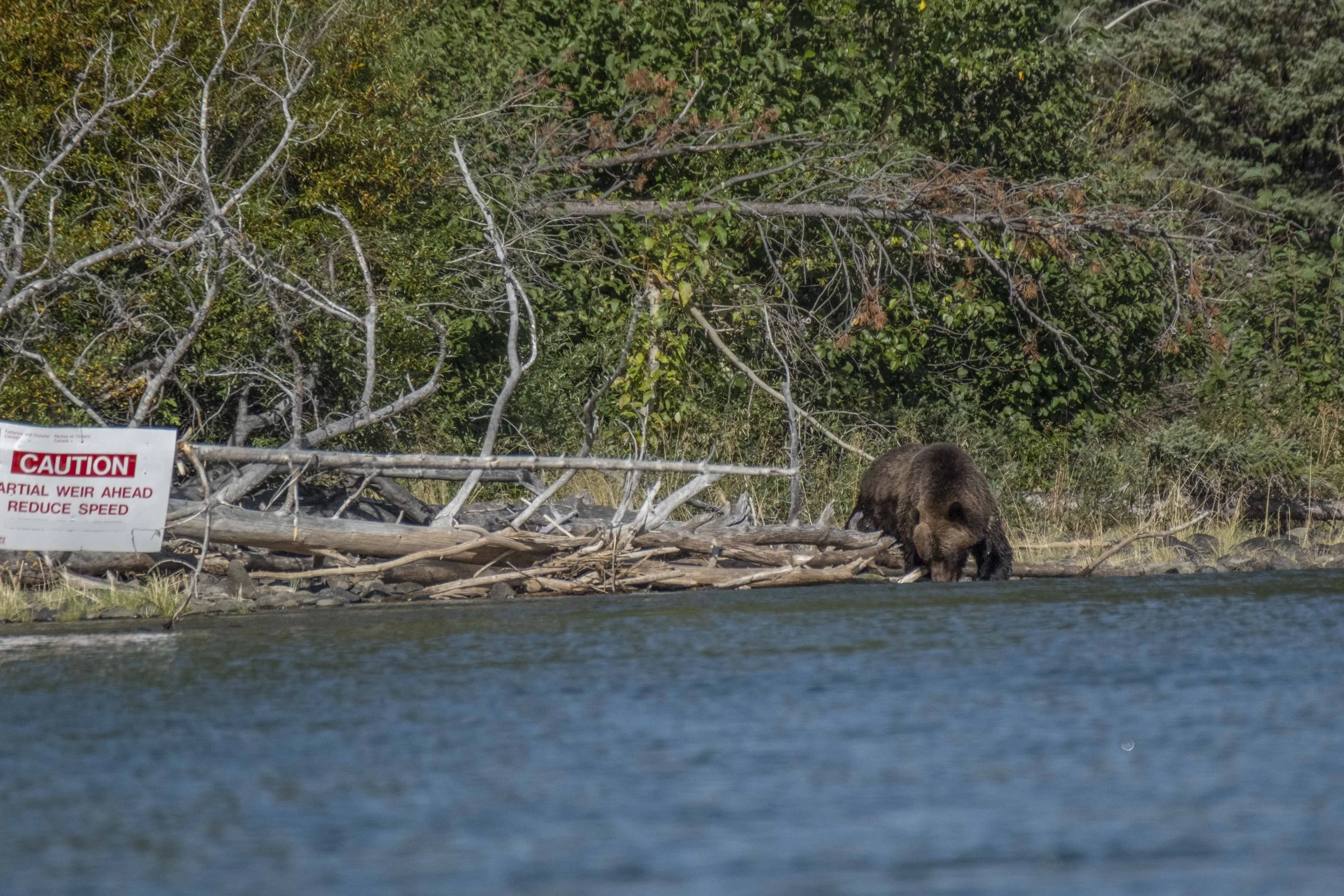 We headed downstream again towards the turnaround point where the fisheries team was researching the salmon (and lack thereof). When we arrived, two researchers, backs turned to us and hip deep in the river, were riveted on a big grizzly who, ironically, stood equal distance on the other side of a Caution sign. I was so focused trying to capture the bear, I didn’t have a chance to get the guys and the bear in the same frame. It was one of those missed moments that will stay in my imagination.