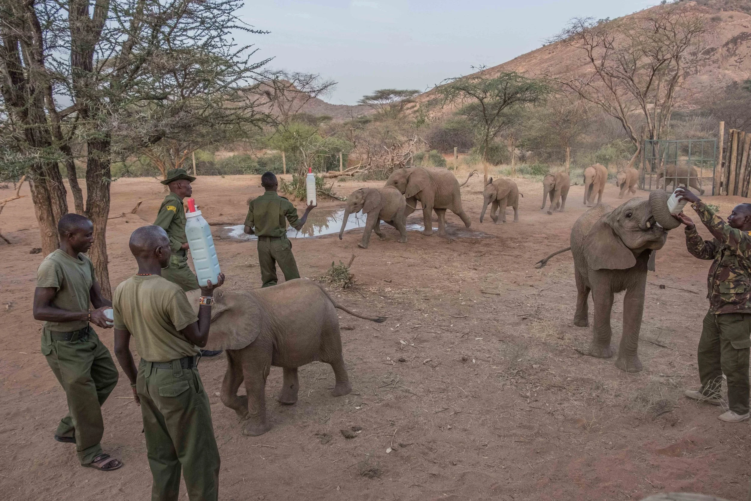 The orphan elephants race in for their mid morning feeding.