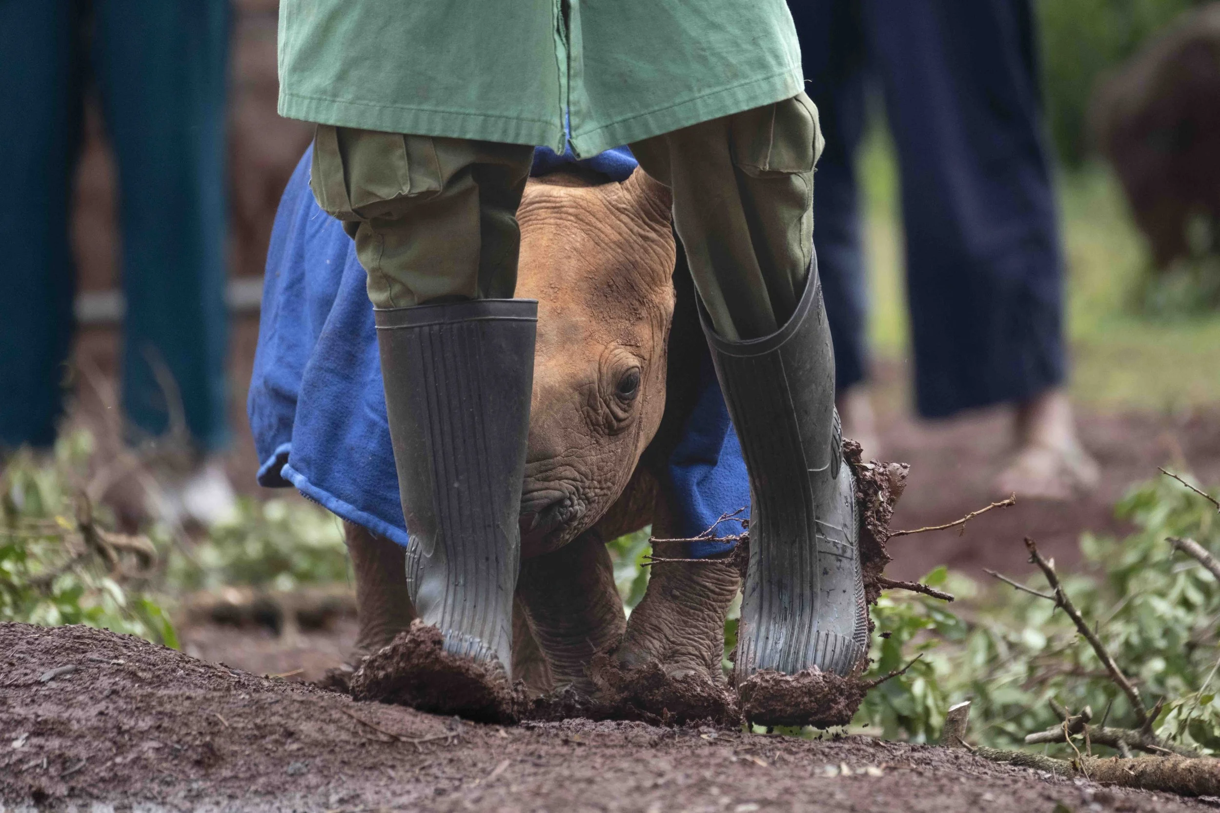 Visitors to David Sheldrick Wildlife Trust learn about wildlife rescues like little Raha an orphaned endangered black rhino. Raha will be cared for until she is old enough to be reintroduced to the wild. © Kathy Karn