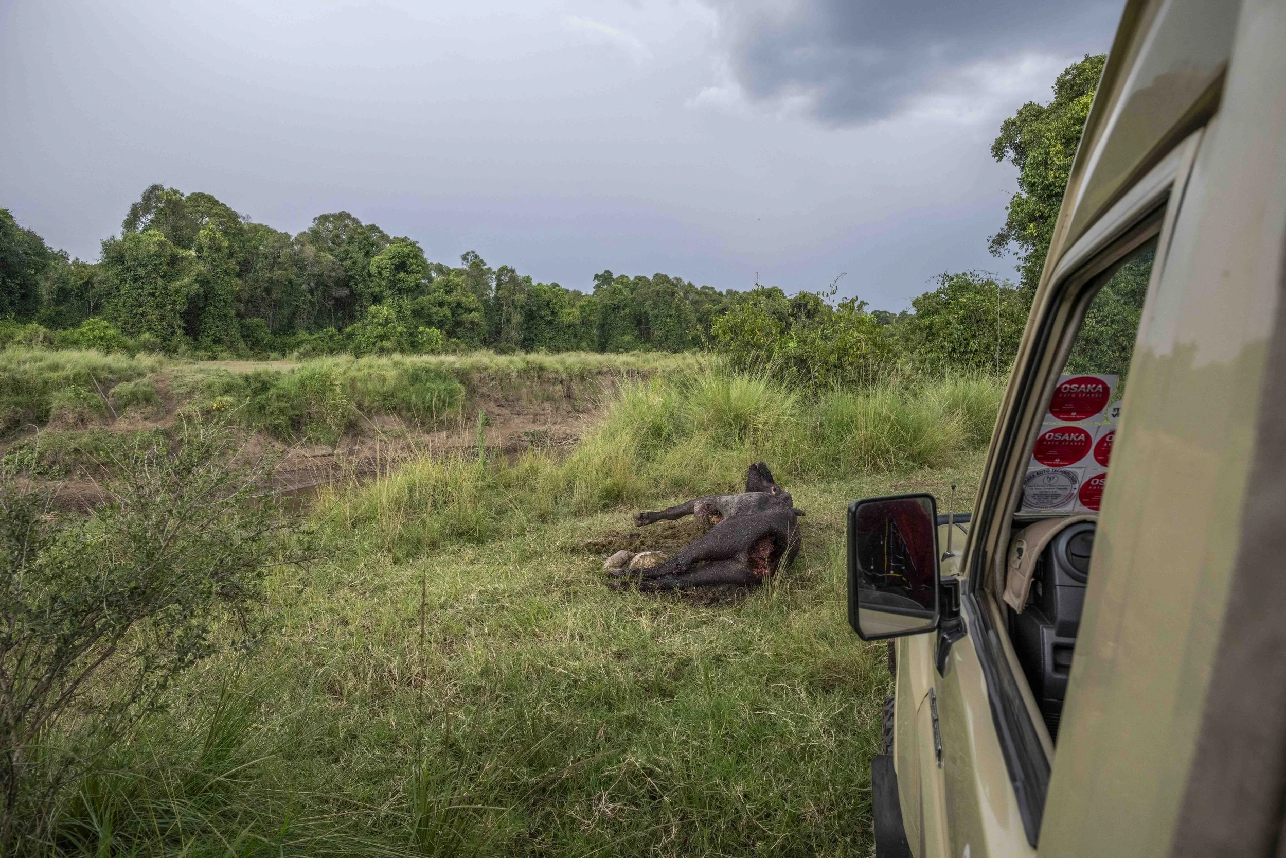 The following morning, we heard via the “jungle news” that the four lionesses had killed a Cape buffalo. We set off in pouring rain to check out the story. We followed a narrow path through the bush along the edge of a river and found a huge carcass of a cape buffalo, eviscerated and stiff in death. The smell was unbelievable – I don’t have the words …..