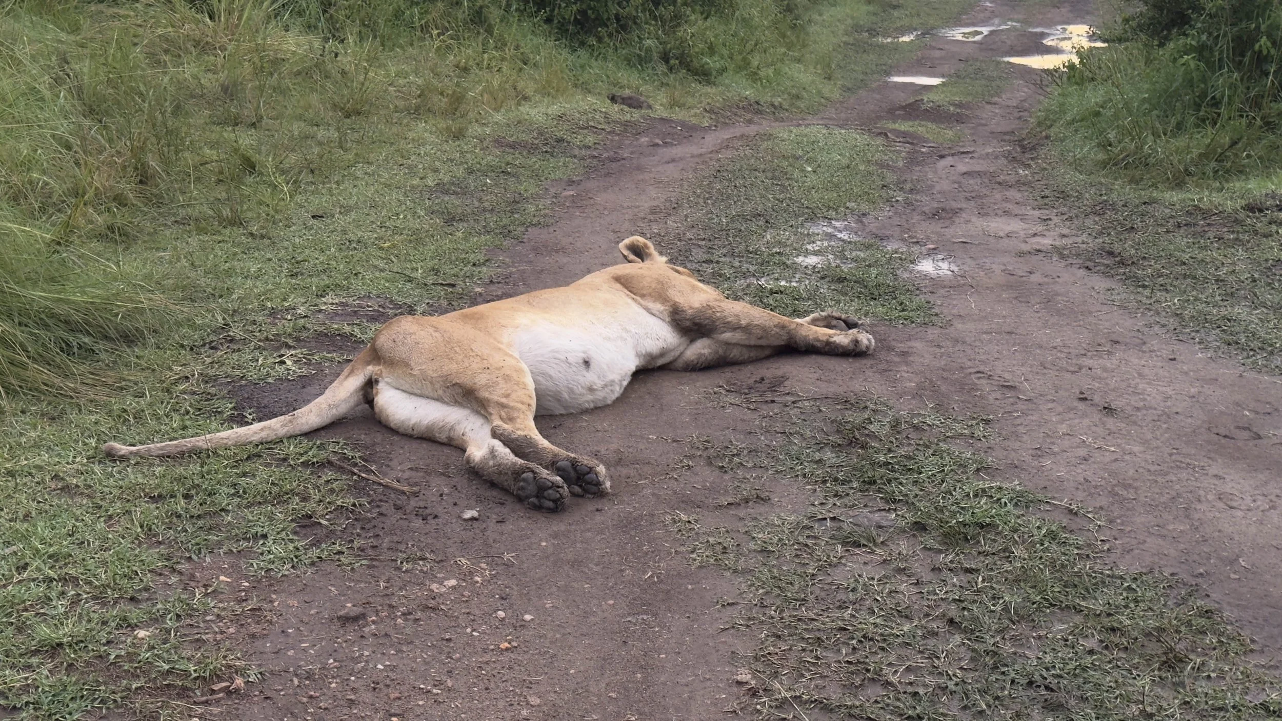 This feline team killed a Cape Buffalo! The body lay near a cliff edge. How did they keep it from toppling into the river? It must have been an extraordinary battle. We came across one of the cats comatose on the road. Her swollen belly told the story of a big feast. Memories of post-Thanksgiving dinner came to mind.