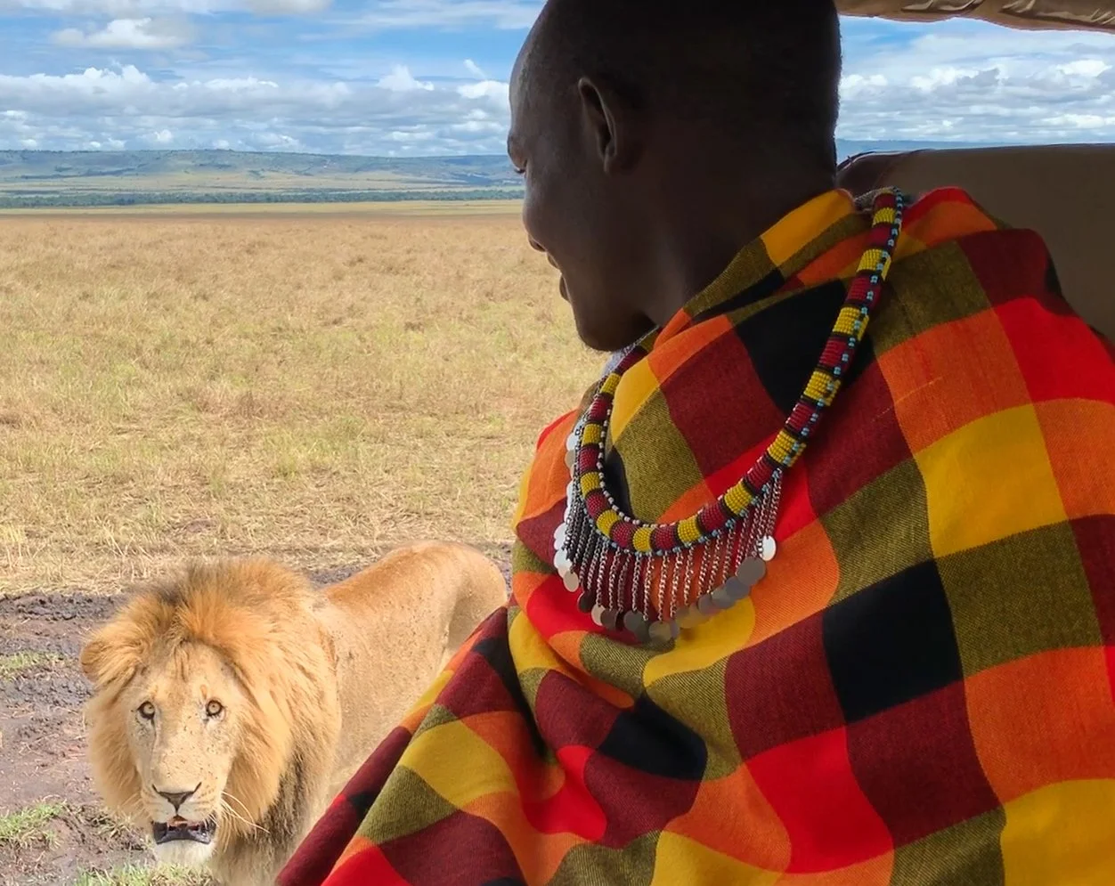 Maasai friend and guide Joseph Mutemi, enjoys a respectful moment with a lion. ©kathykarn