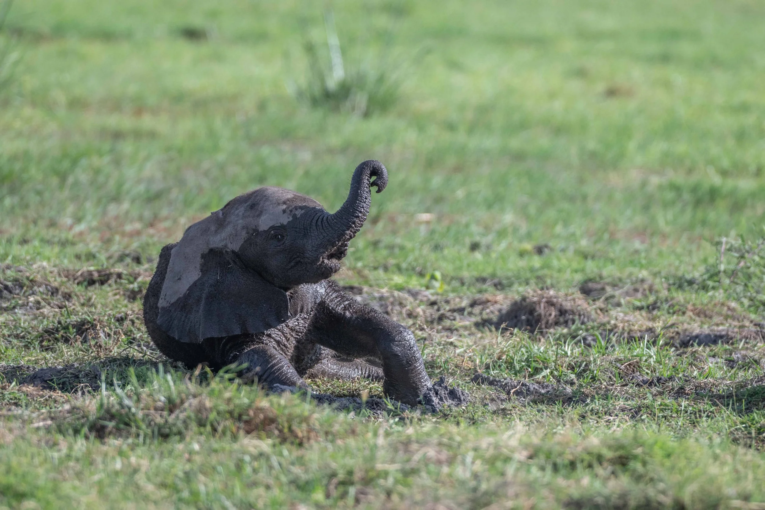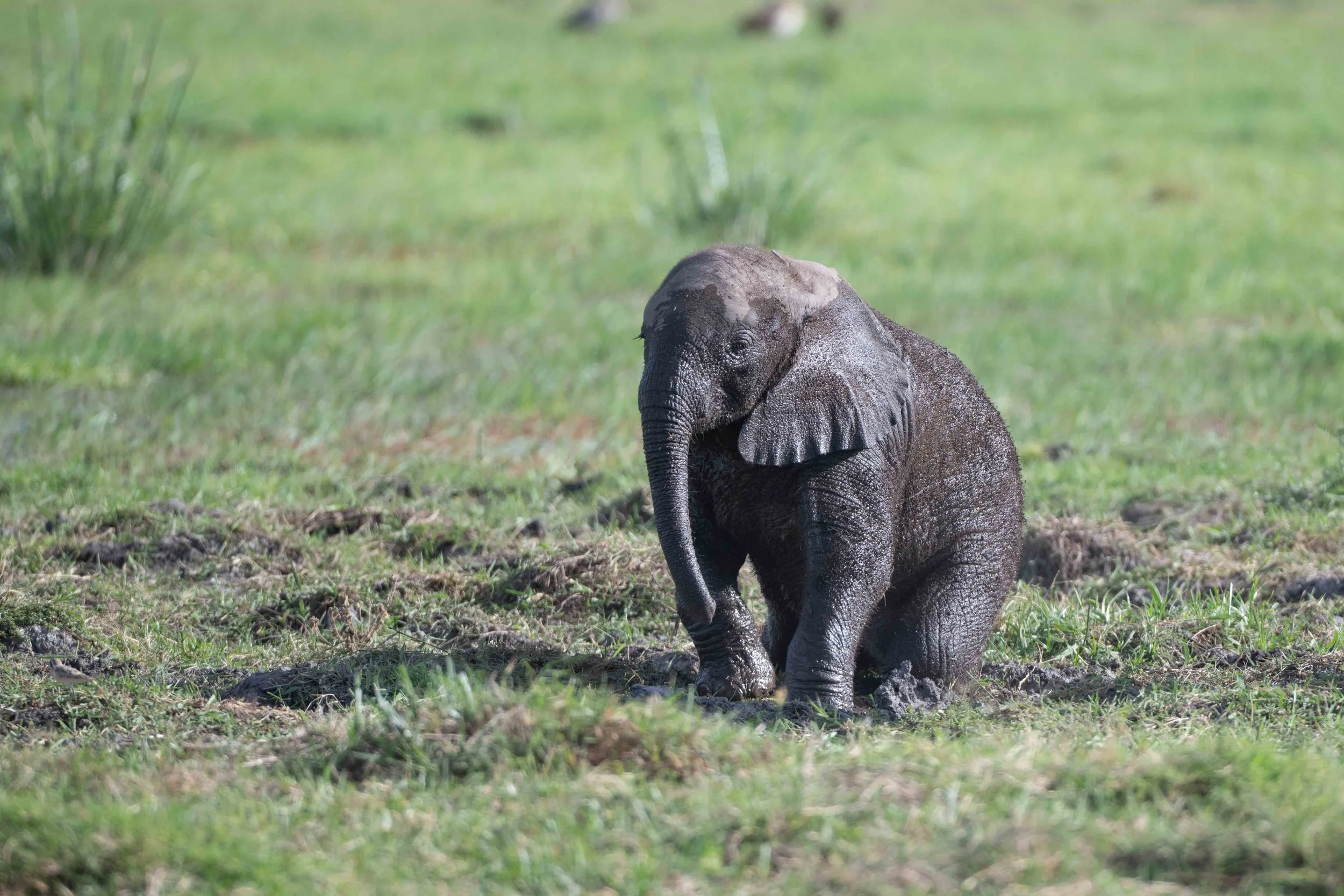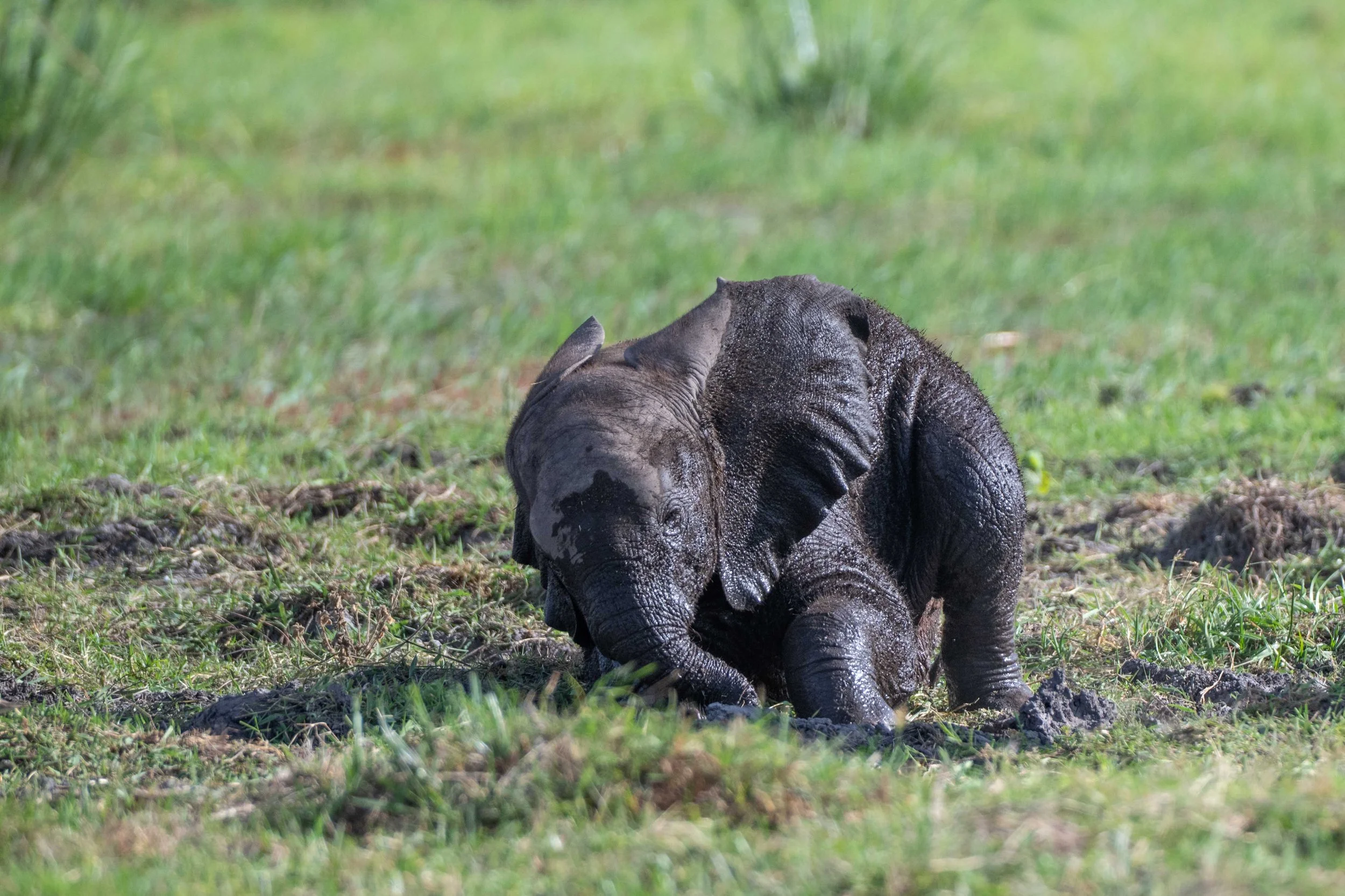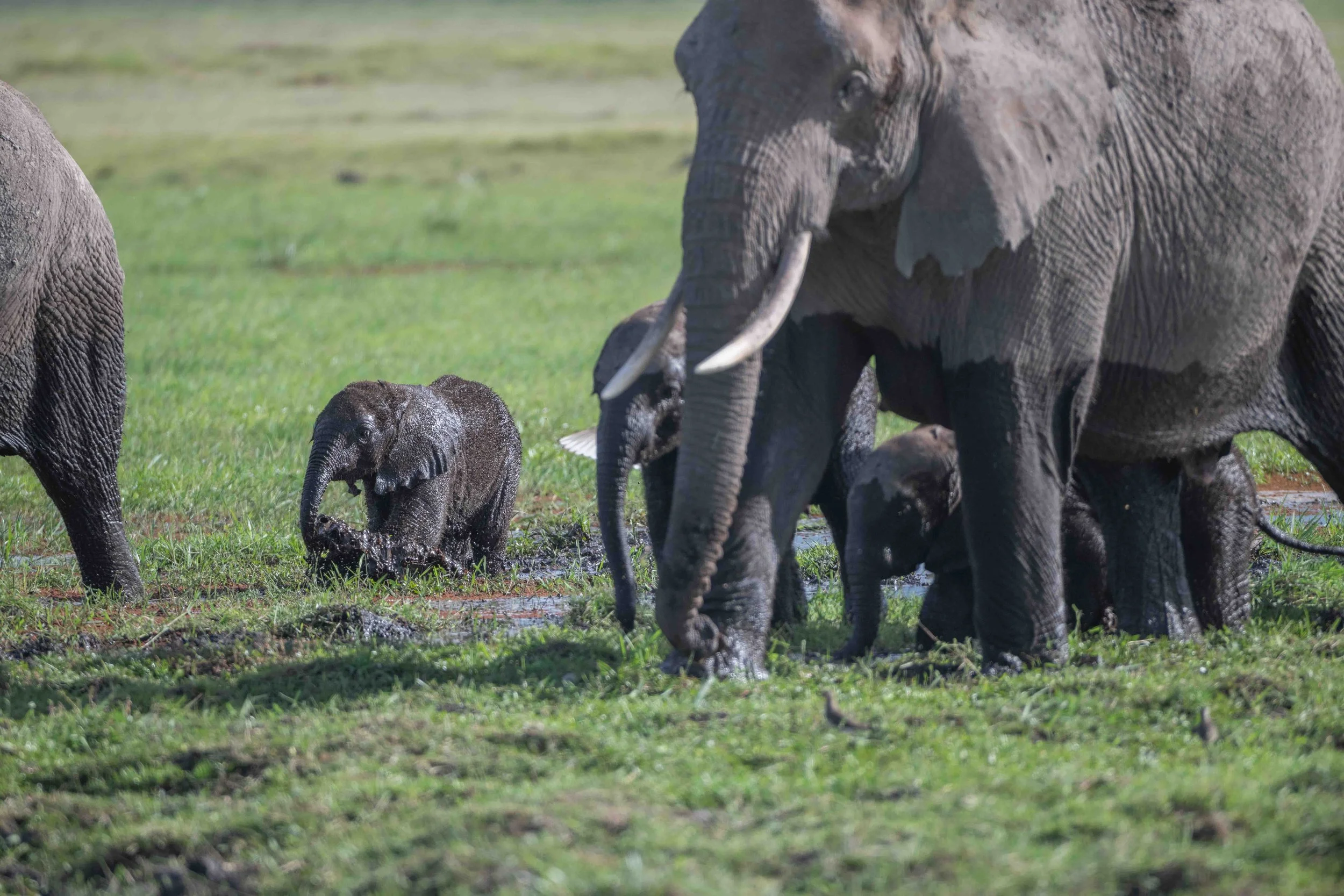 We parked close to one of the swamps when an elephant family paused to drink. At first, I didn’t notice the tiny baby tucked in behind a cow as she drank. Once sated, mama proceeded to slosh through the swamp towards us revealing a newborn calf dutifully following behind.