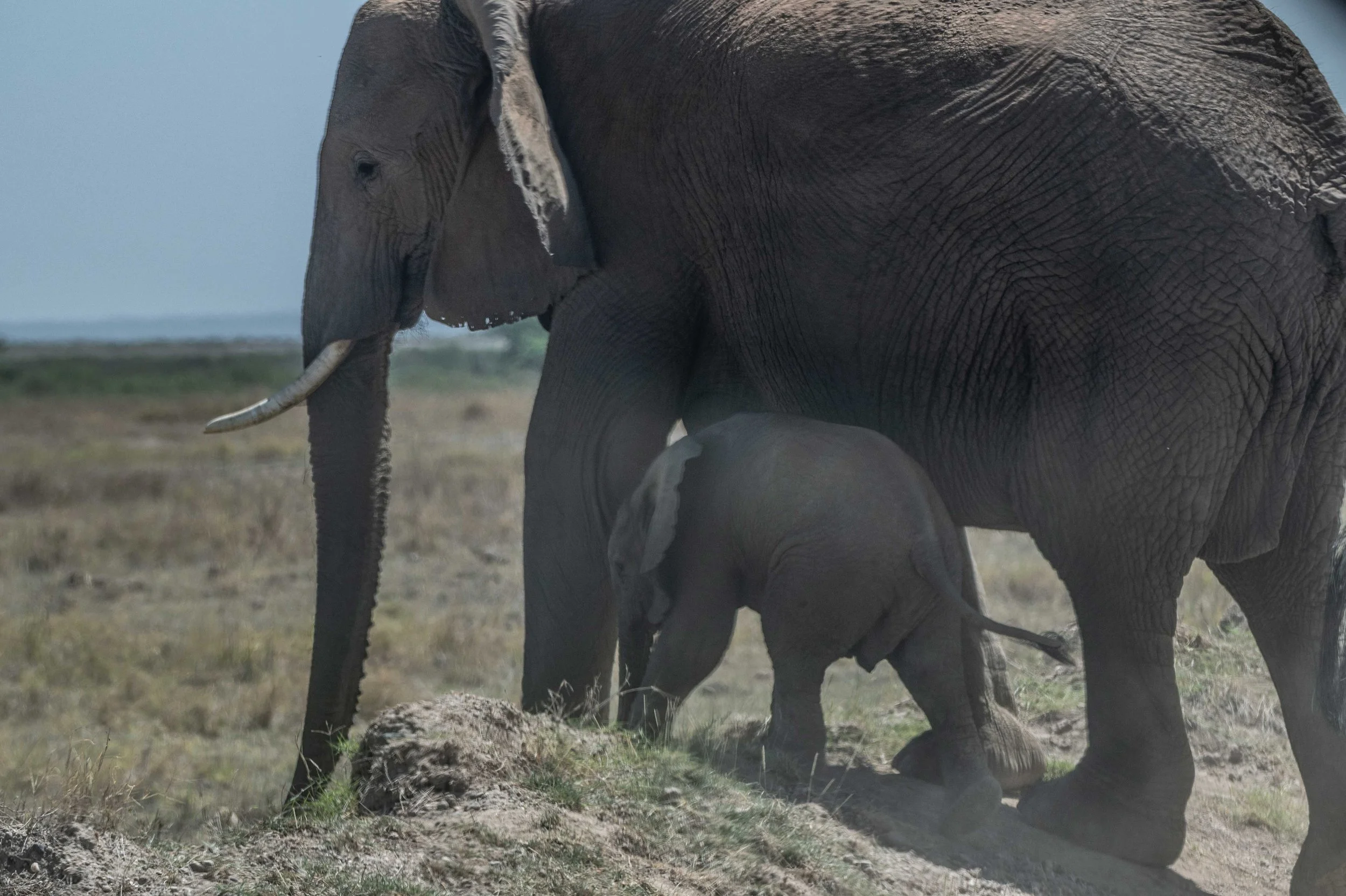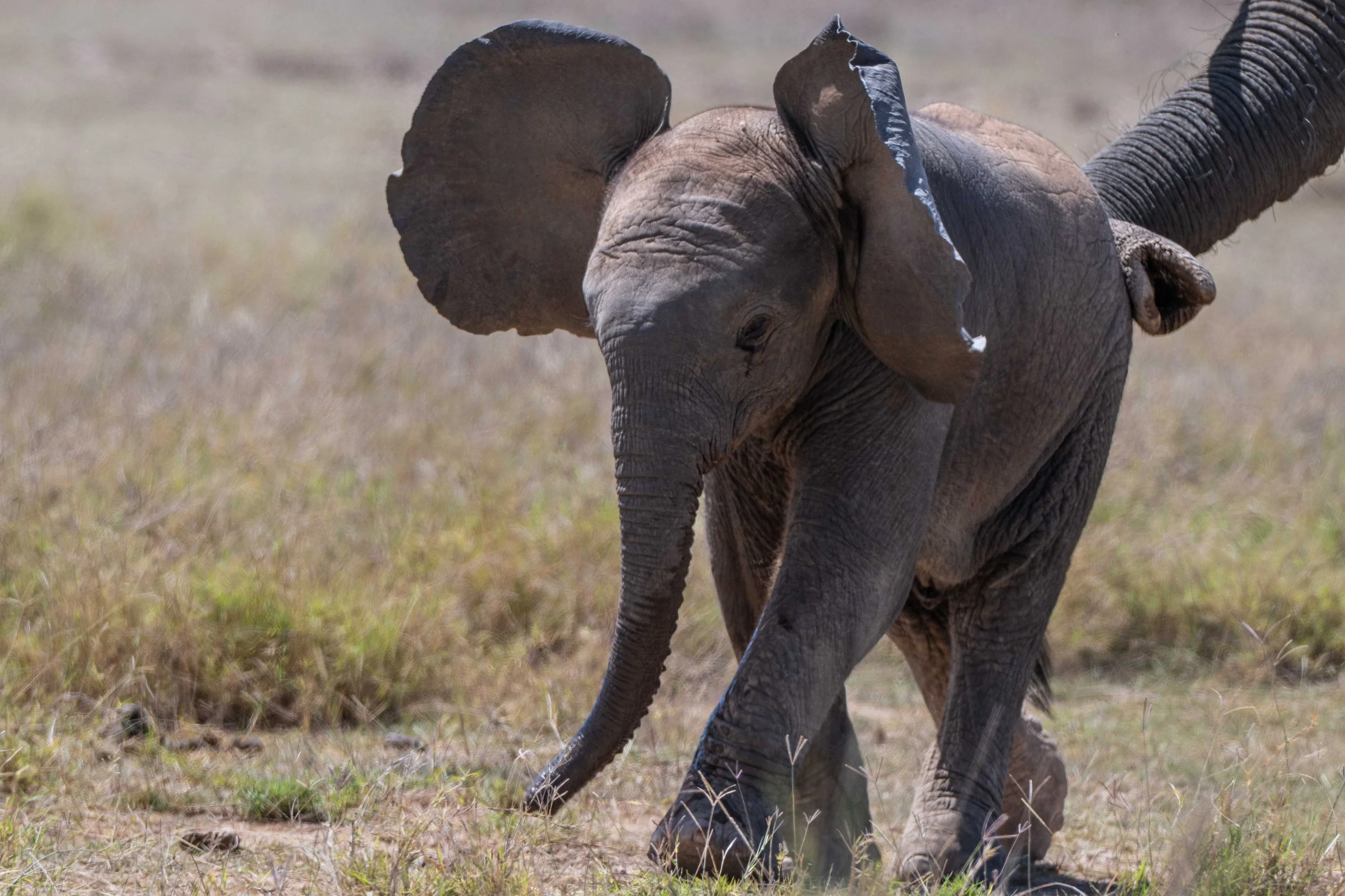 OMG too sweet! I whispered when my long lens discovered a tiny calf faithfully following its mother’s heels. With every step the cow’s tail swished rhythmically back and forth across the baby’s back. An elephant’s tail is minimal compared to some tail carriers, but it plays an essential role in connecting a baby to its mother. The stiff tail hairs are just the right height to touch the baby’s back giving it reassurance and guidance as the family travels in the endless search for water and grazing. Mama can feel the baby at her heels and the baby can feel mama’s protective presence.