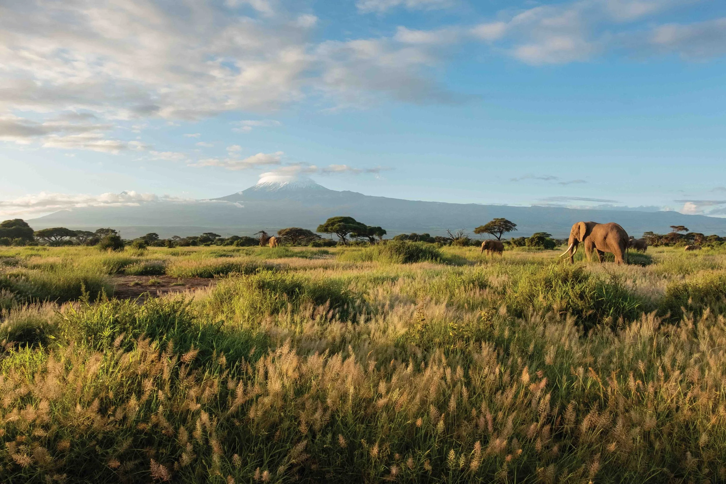 An iconic Amboseili morning: Mt. Kilimanjaro, flat topped acacia trees and elephants. ©kathykarn