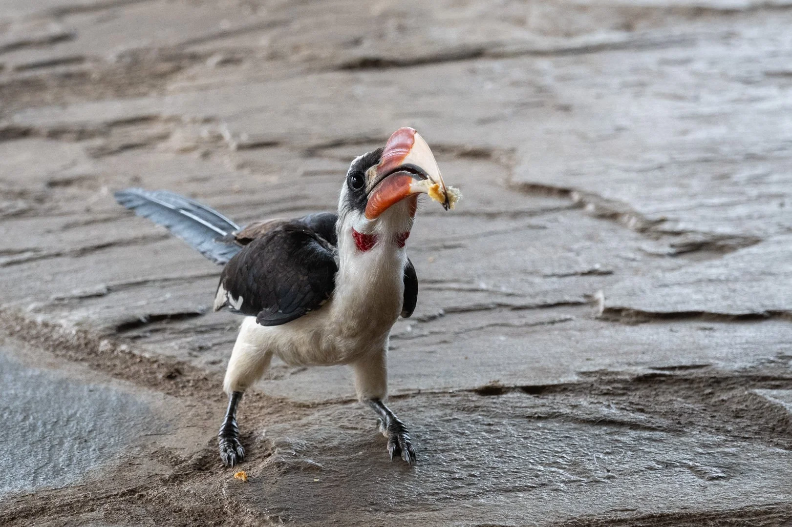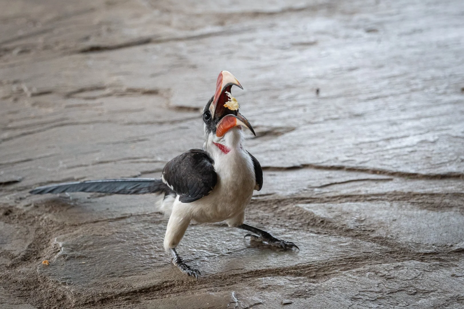 Just like the puppet Zazu, hornbills really do have long, curved red and yellow beaks, white underparts, mottled black-and-white wings, and relatively long tails. And, like crows, they are omnivorous opportunists.